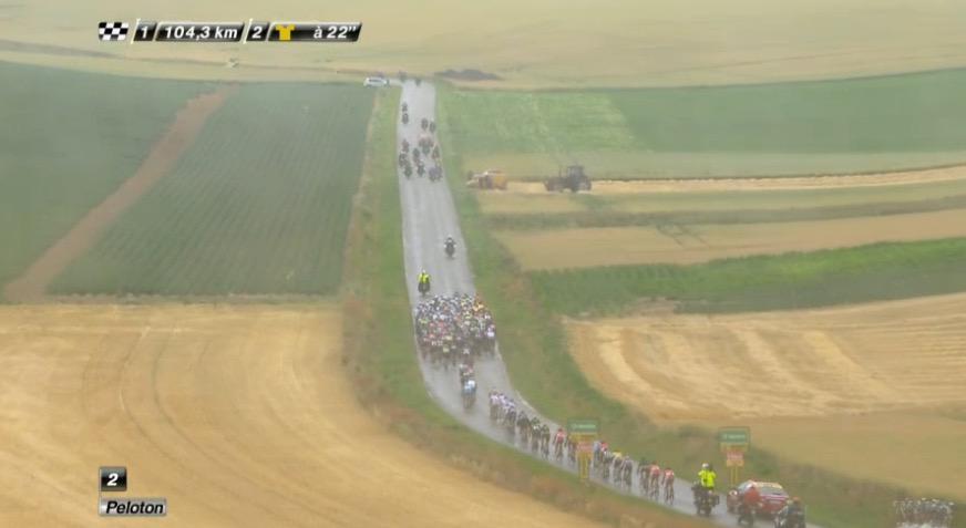 Etap düz profilde olsa da yağmur ve sert yanal rüzgarlar pelotonu bir hayli zorladı; öyle ki bitime 70 km kala Etixx-QuickStep ve BMC tempoyu arttırınca peloton ikiye bölündü ve fark yer yer 3 dakikaya kadar açıldı.