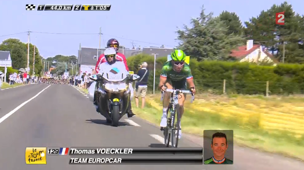 44.6 km kala pelotondan thomas voeckler kaçtı. kaçışların ve mimiklerin ustası, artık zamanı geldi dedi.