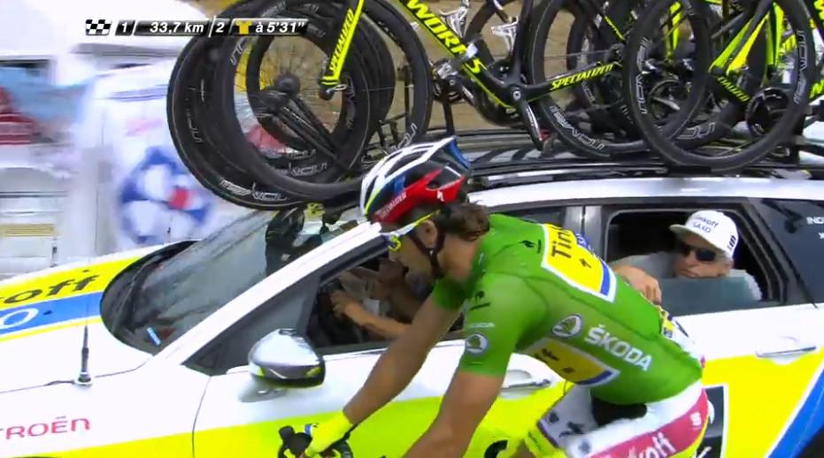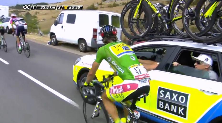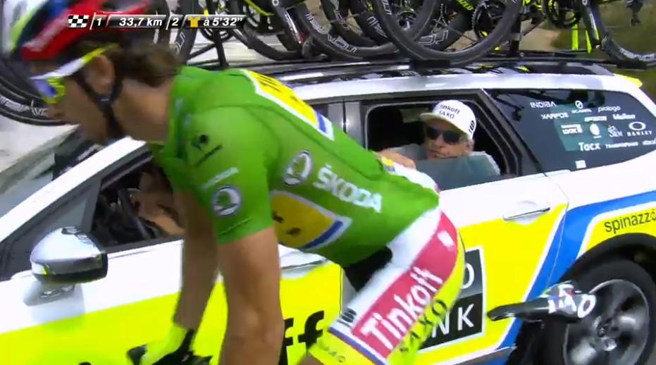 https://pbs.twimg.com/…ia/ckm9uqewiaapxtj.jpg:largepeter sagan, takım otomobilindeki takım sahibi, baş belası oleg tinkov ile konuşuyor.