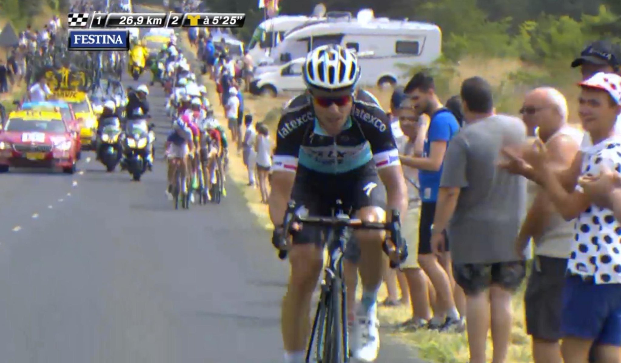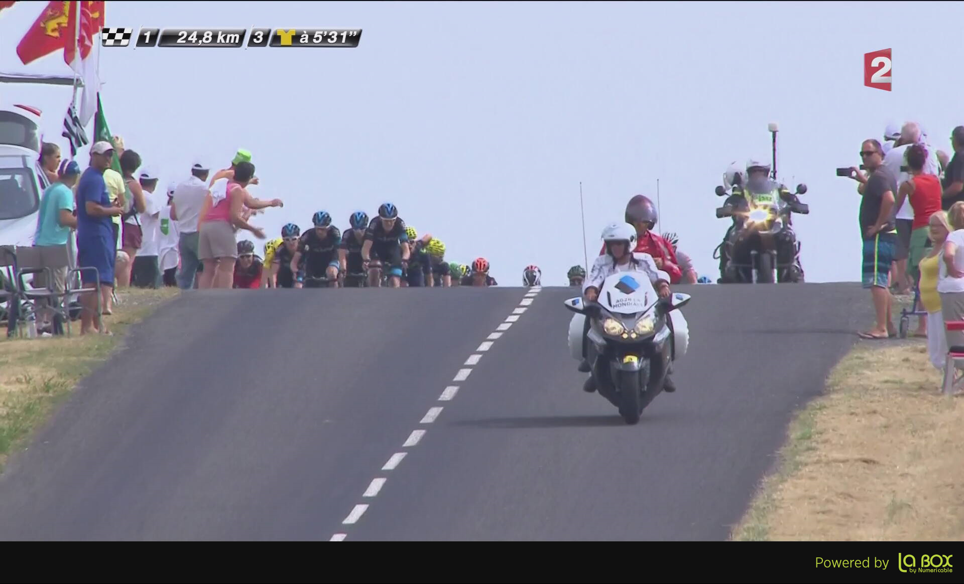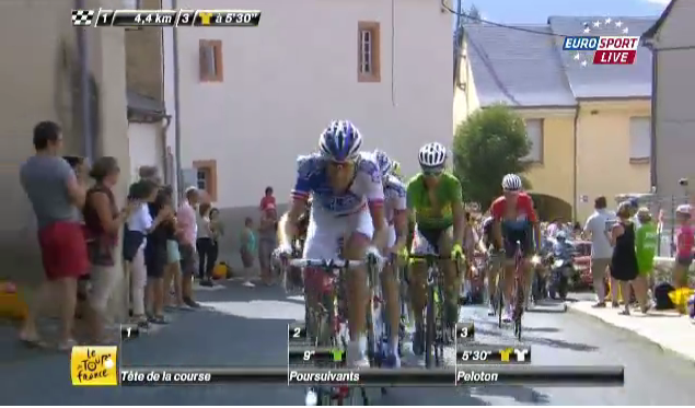 takip grubu kaçış grubunu yakaladı. andriy grivko (astana), romain bardet and jan bakelants (ag2r-la mondiale), thibaut pinot, matthieu ladagnous and jérémy roy (fdj), peter sagan (tinkoff), jonathan castroviejo (movistar), greg van avermaet (bmc), koen de kort (giant-alpecin), simon yates (orica-greenedge), michal golas, rigoberto uran (etixx-quick step), cyril gautier (europcar), bob jungels (trek), ruben plaza (lampre-merida), kristjian koren (cannondale-garmin), jarlinson pantano (ıam cycling), pierre-luc périchon (bretagne-séché environnement) ve stephen cummings’den (mtn-qhubeka) oluşan 20 kişilik bir kaçış grubu var. 4 dakika geriden luis angel maté (cofidis), 8.15 dk geriden peloton geliyor.