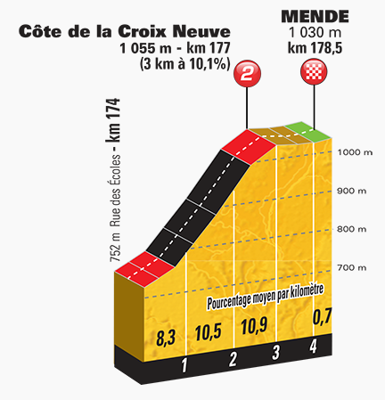 - Côte de la Croix Neuve tırmanışı 3 km uzuzluğunda, halihazırda fazla bir irtifa kazancı yok: 300 mt. Ancak ortalama eğim %10. Tırmanışın başında %6 civarındaki eğim bir anda %10, %12 civarına çıkıyor ve bu öyle anlık da değil, 500 mt aralıklara eğimin şiddeti artıyor. Kısacası tırmanışa başlayan ve zafere ulaşmak isteyen elit pelotonun dahi işi zor.