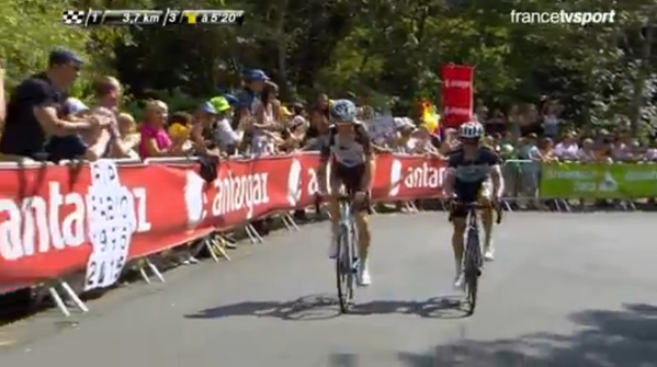 %12 eğimde, 3.4 km kala bardet atak yapıp öne çıktı. simon yates, ona tutundu. peloton şimdi başladı tırmanışa.