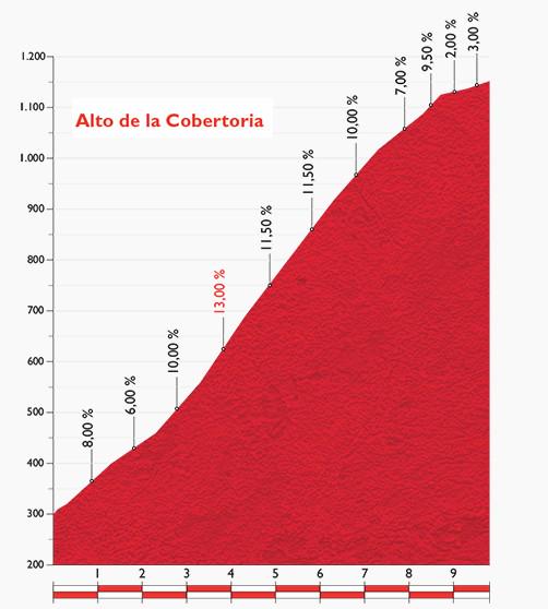 Alto del Cordam geçilir geçilmez başlayacak Alto de la Cobertoria tırmanışı eteklerinde artık pek de önemi kalmayan bir sprint kapımız var, zirveyi ilk geçip de inişte yakalanmayanlar birden duvara toslayacaklar: CAT1 sınıfındaki Cobertoria geçidinde elit tırmanışçılardan oluşan mini peloton zirvesindeki %2-3’lük eğimleri saymazsak %6-13 arasındaki eğimlerle boğuşacak.
