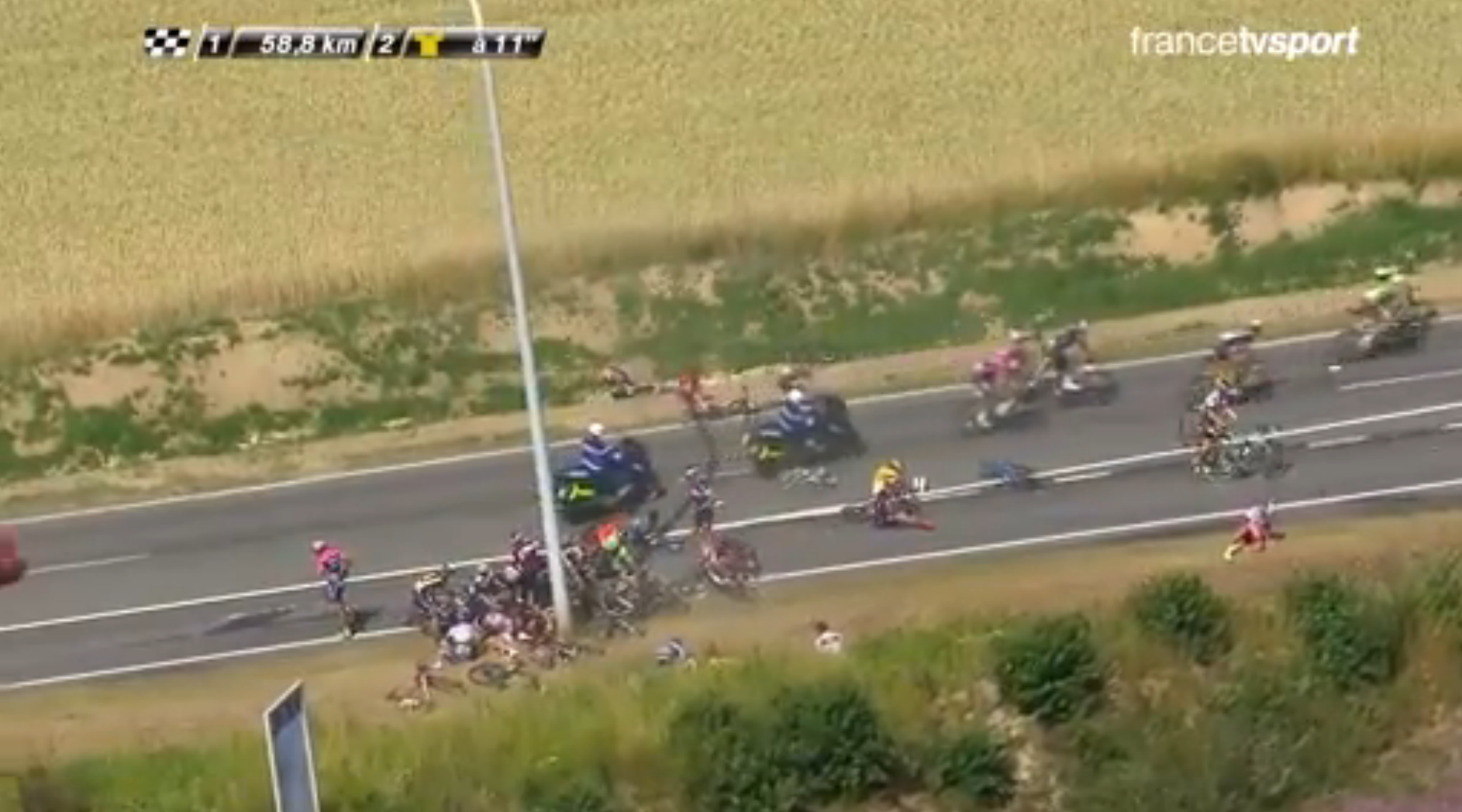 Etaba damgasını vuran asıl olay sarı mayonun el değiştirmesinden çok etabın bitmesine 50 km kala yaşanan katliam gibi kaza oldu. Öyle ki yarış durduruldu. Tabii bunda Team SKY ve Astana takımlarının fırsattan yararlanıp pelotonu bölerek kendi liderlerini öne taşıma taktiğini uygulamaları etkili oldu.