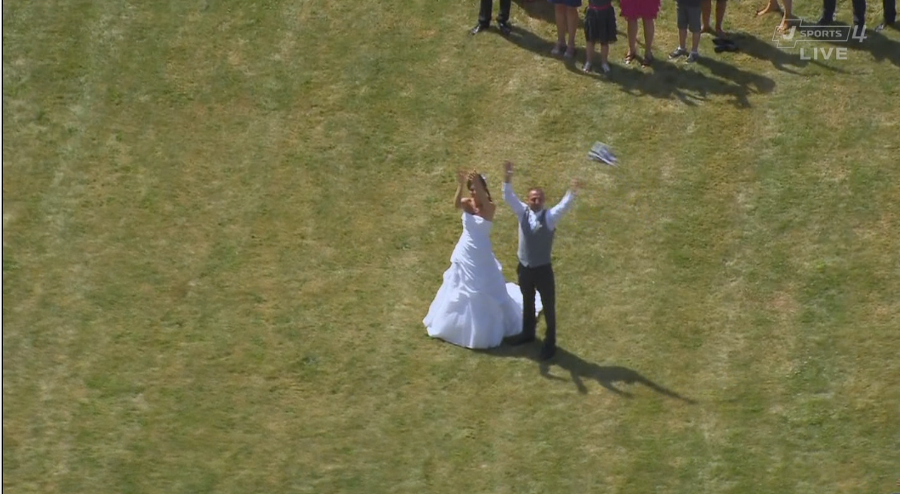 bir gelin ve damat, insanlardan oluşan kalbin içinden tura selam veriyor. mutluluklar.