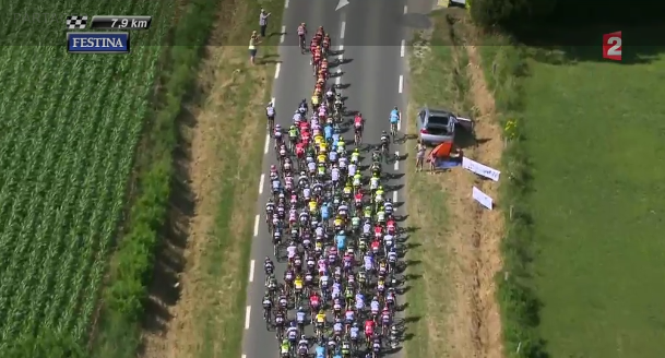 71 km pelotondan bir anda bir grup kaçtı ve öndekileri yakaladılar. lars boom (astana), jeremy roy (fdj), peter sagan (tinkoff), lars bak, thomas de gendt and andré greipel (lotto), john degenkolb, roy curvers and koen de kort (giant), michal kwiatkowski, mark cavendish and michal golas (etixx), pierre rolland, bryan coquard and angelo tulik (europcar), frédéric brun ve pierrick fédrigo’dan (bretagne-séché environnement) oluşan 17 kişilik bir grup oluştu.