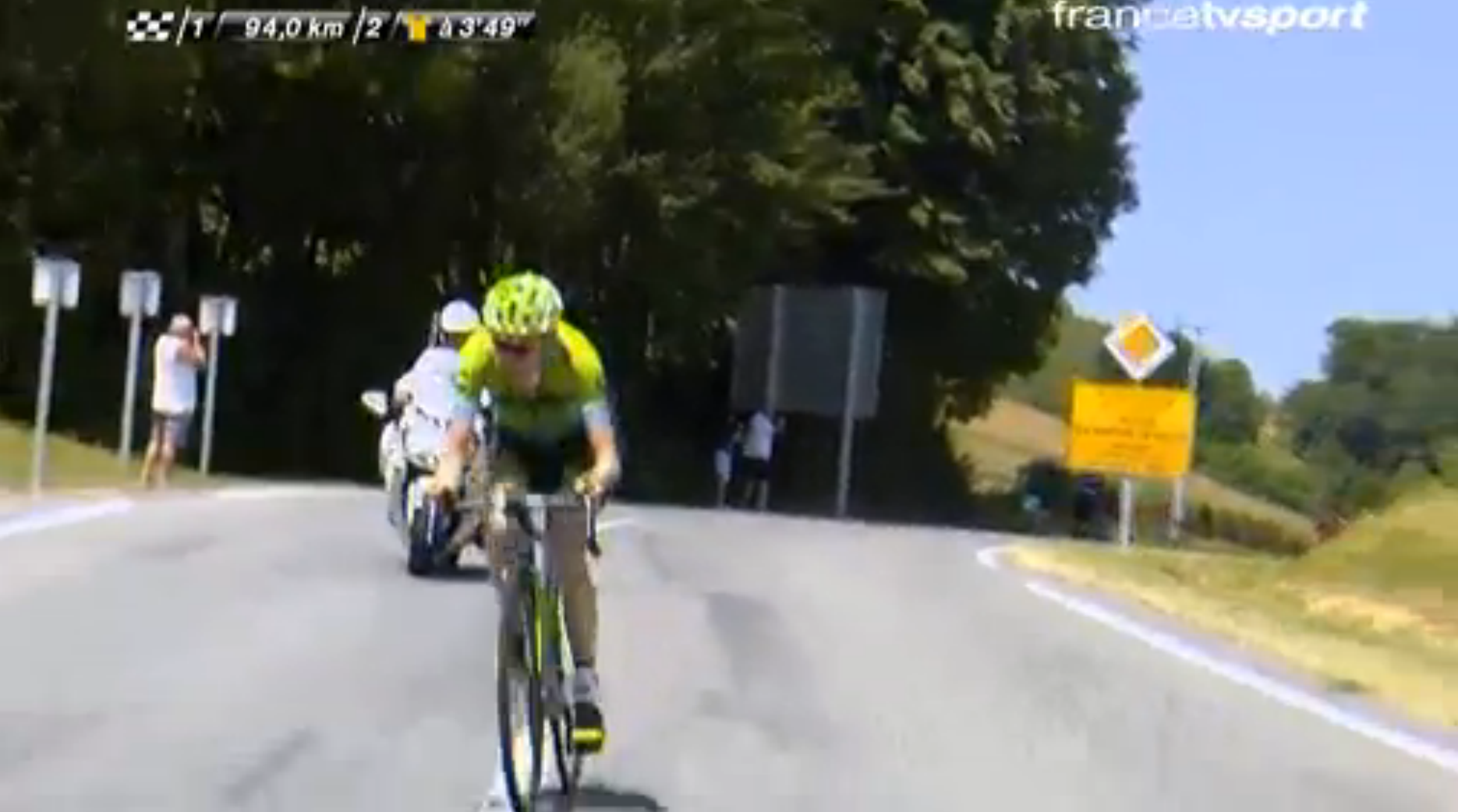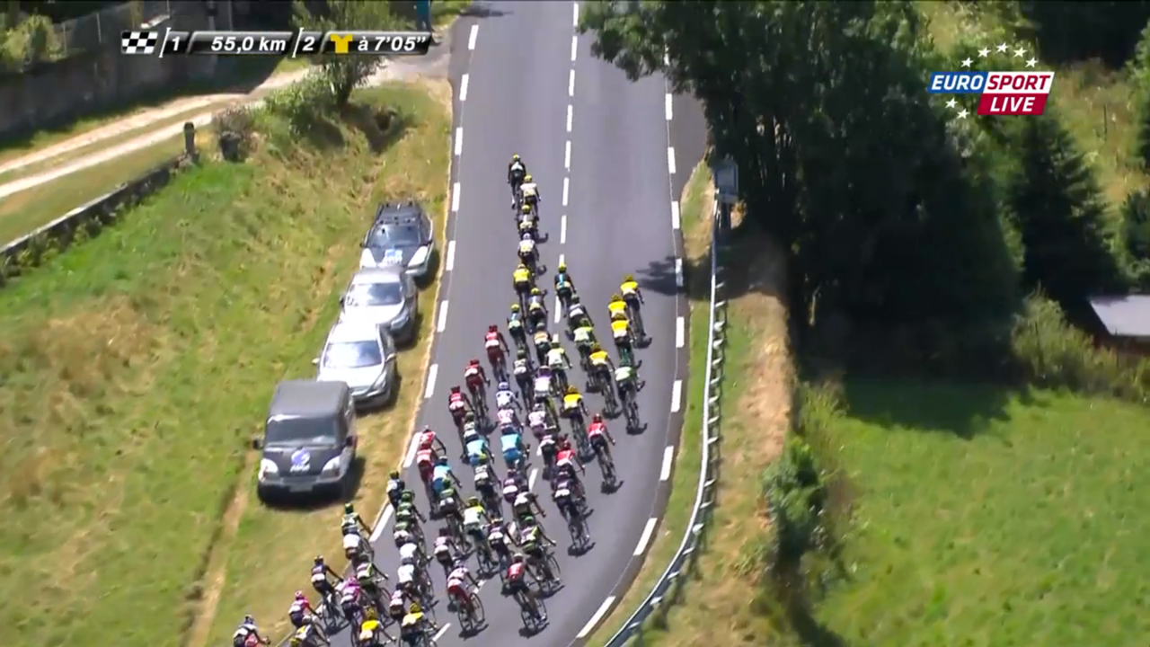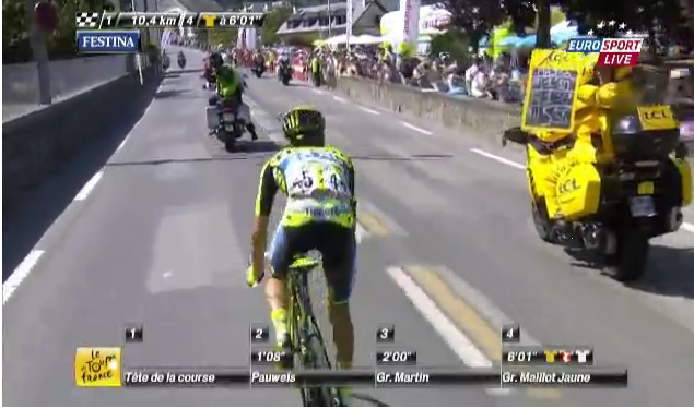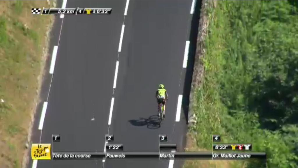 thomas voeckler (europcar), rafal majka (tinkoff-saxo), serge pauwels (mtn-qhubeka), steve morabito, arnaud démare (fdj) julien simon (cofidis) ve emmanuel buchmann’dan (bora-argon 18) oluşan kaçış grubu ile pelotondan kaçan dan martin (cannondale), arasında 3.25 dk kadar bir fark var. diğer kaçan andriy grivko (astana), 3.55 dk kadar geride. peloton ise 4.35 dk geride takip ediyor.