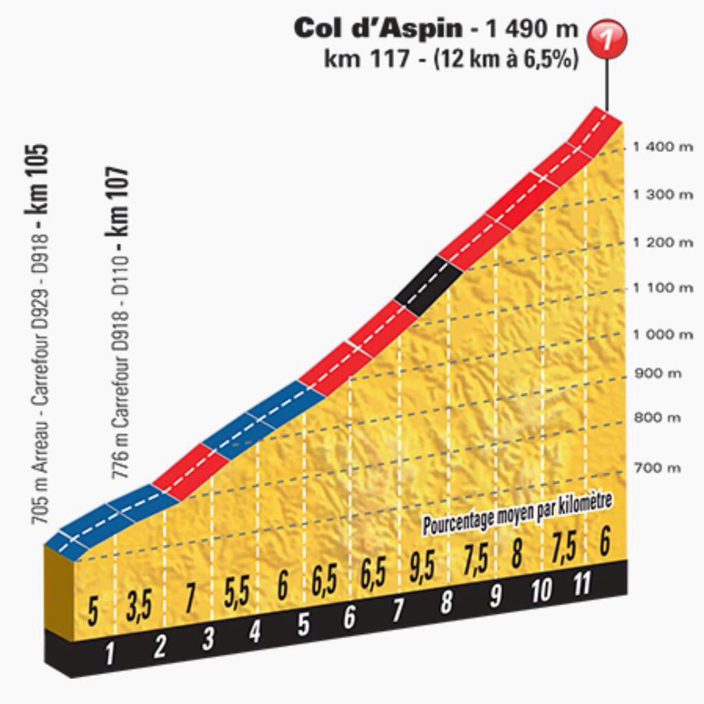 - 105. km’den sonra peloton 705 metreden 1490 metre rakıma, CAT1 sınıfından Col d’Aspin zirvesine tırmanacak ki, 12 km uzunluğundaki zirvenin ortalama eğimi %6,5. Zirveye dek kaçanlara izin verilecek gibi, zira bir de Tourmalet tırmanışı var.