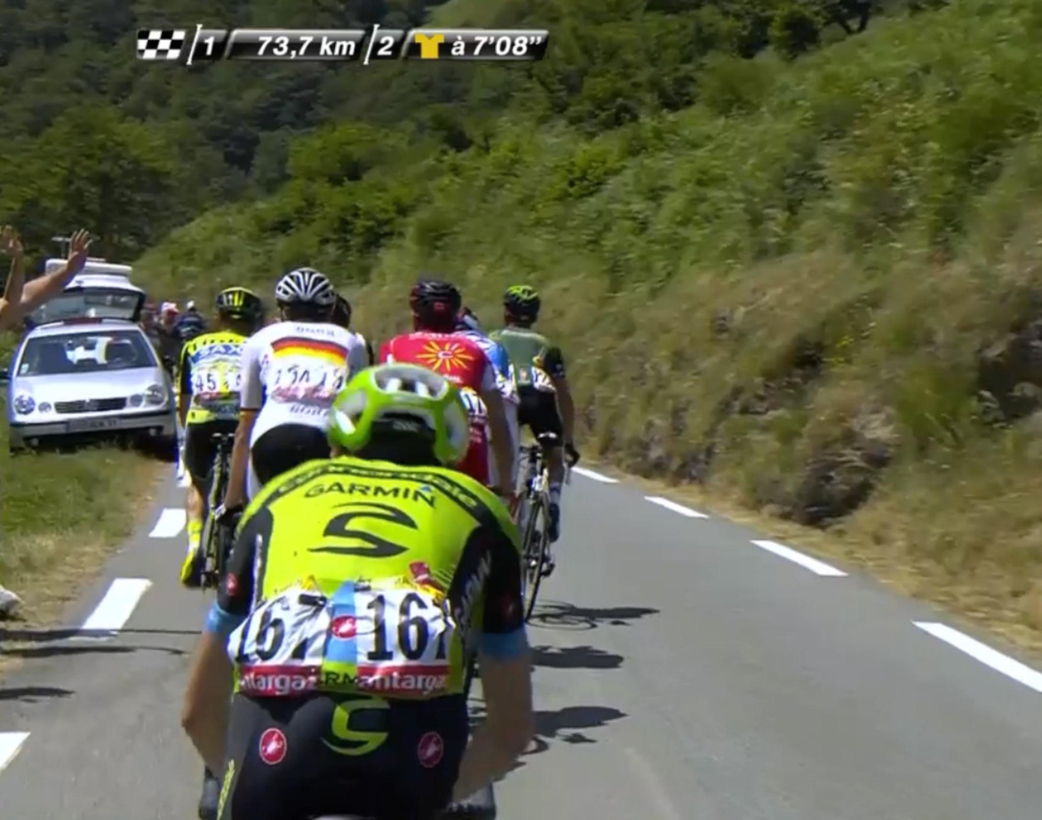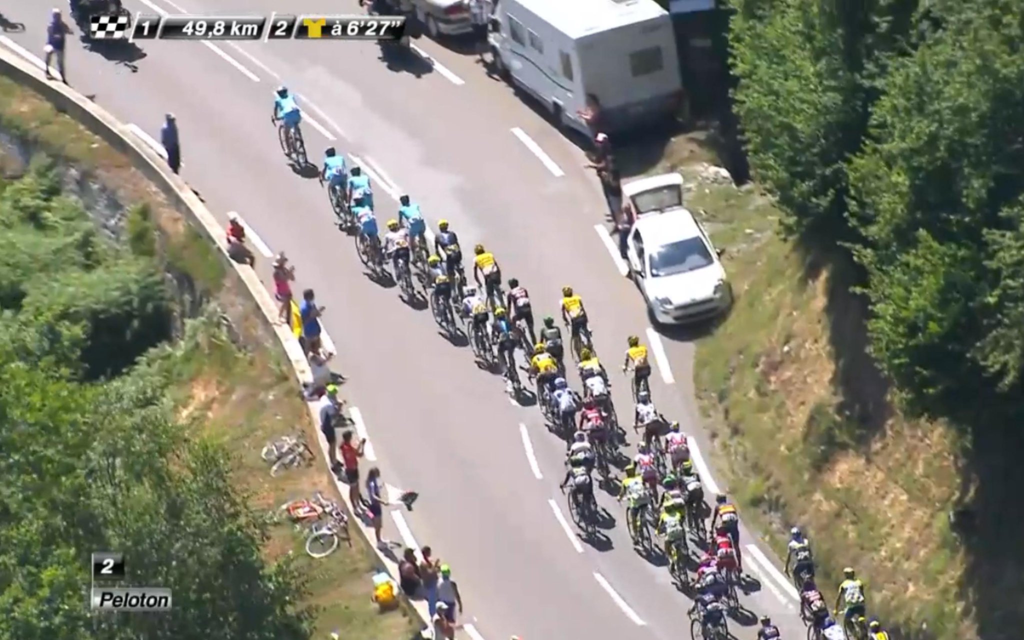 83 km kala, 1. kategoriden col d’aspin (1490 m yükseklik, 12 km uzunluk, %6.5 ortalama eğim), tırmanışına kaçış 7’lisi başladı. peloton 6 dk kadar geride.