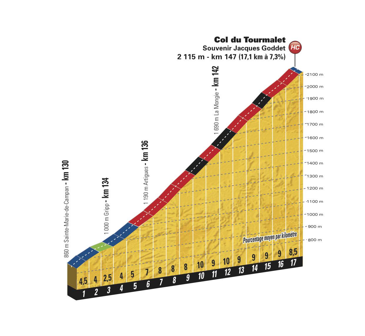 - Col d’Aspin’den sonra 864 metreye dek inişe geçilerek 2115 metre rakıma, HC sınıfındaki Col du Tourmalet zirvesine tırmanılacak ki, inişi sağlam olan Nibali, Contador gibi kürsünün diğer basamakları için hevesli favoriler 17 km uzunluğundaki zirveyi zaman farkını azaltabilmek adına önde çıkmalılar ki, başka çareleri de yok. Eğimin ortalama %7,3 olduğu tırmanış çok canlar yakacak. Favorilerin atağının inişte olmasını diliyoruz, hem fark yaratmak hem de dinlenmek için.