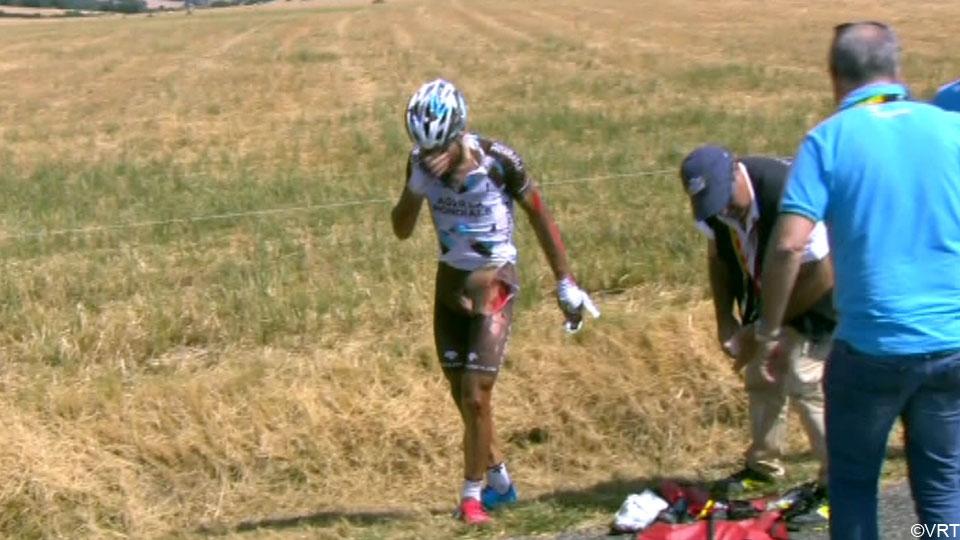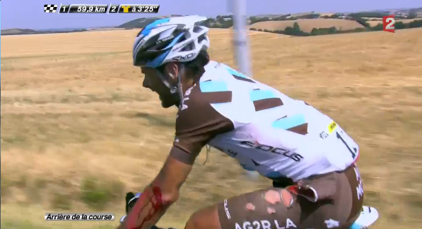 61.3 km kala geçen senenin ikincisi jean-christophe péraud yere kötü düştü. canı fena halde yanıyor. şortu parçalandı. kolu, bacağı kanıyor. devam ediyor ama durumu iyi değil.