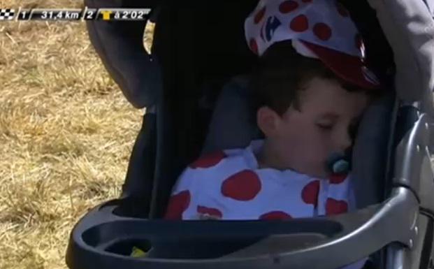kırmızı benekli mayoya sahip ufaklık uyuyor.