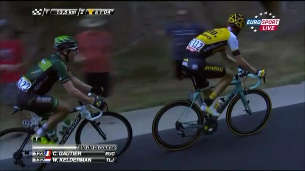 14 km kala wilco kelderman atak yapıp öne çıktı. cyril gautier, arkasına takıldı. thomas de gendt de onların arkasında.