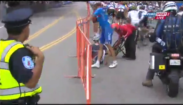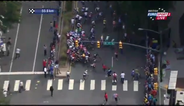 56 km kala çok büyük bir kaza meydana geldi. galiba kristoff düştü ve onun ardından onlarca bisikletçi yere düştü.